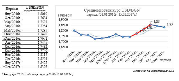 Валутният курс на щатския долар от месец ноември 2016г. запазва високи обменни нива от над 1.80 лева/1 USD. Към дата на изготвяне на прогнозата (10 февруари 2017г.), същият се обменя на нива над 1.84 лева/1 USD, с която тенденция е съобразена и обявената прогнозна цена.